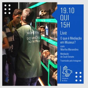 Na próxima quinta feira, dia 19/10, às 15h, a profª. Dr. Martha Marandino participara de uma live com a mediação de Cauê Donato no Instagram do Museu Catavento para responderem a pergunta “O que é mediação em museus?”