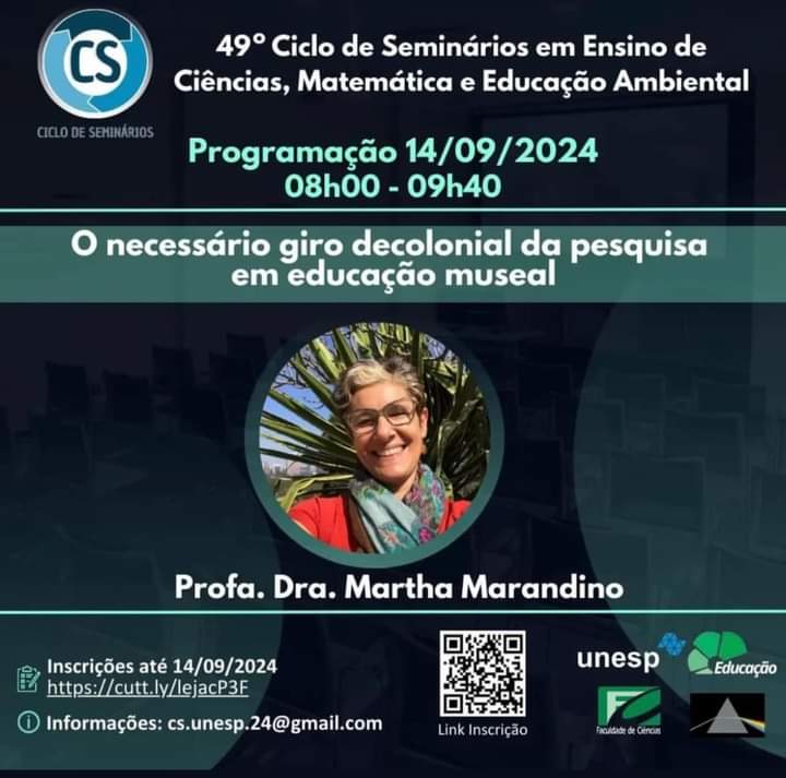 É com grande satisfação que o Programa de Pós-Graduação em Educação para a Ciência da Unesp, campus de Bauru, retoma o Ciclo de Seminários em Ensino de Ciências, Matemática e Educação Ambiental. No sábado, 14 de setembro, de 8h às 9h40 a profª. Drª. Martha Marandino estará conosco (virtualmente) com a palestra “O necessário giro decolonial da pesquisa em educação museal”